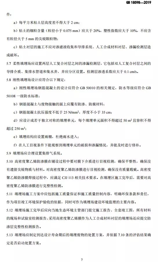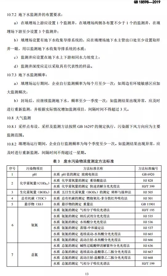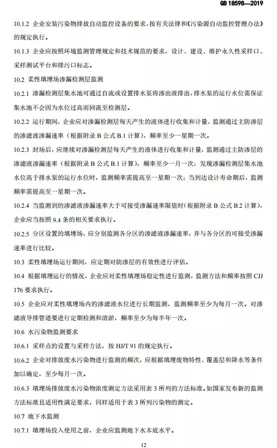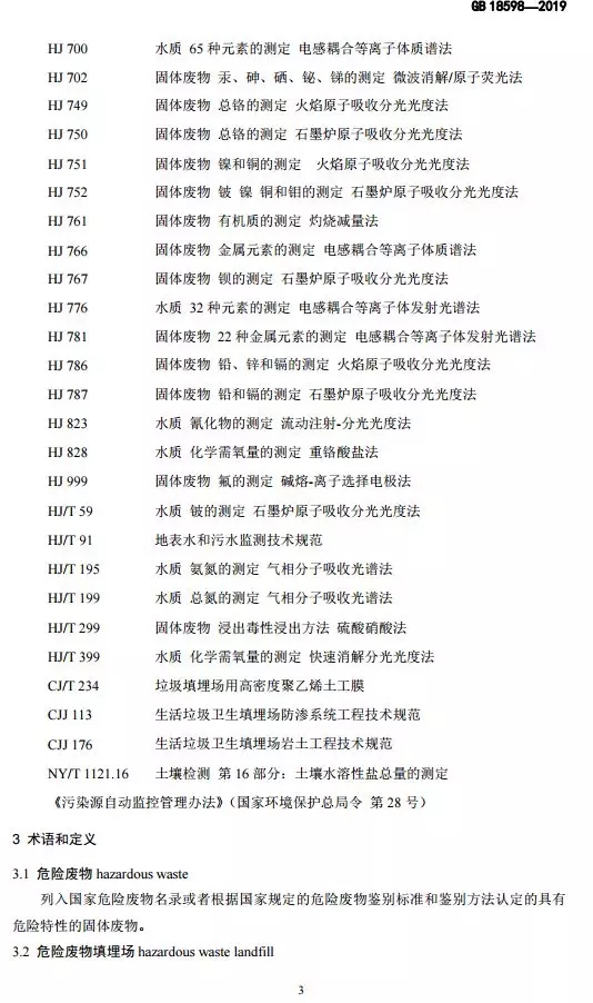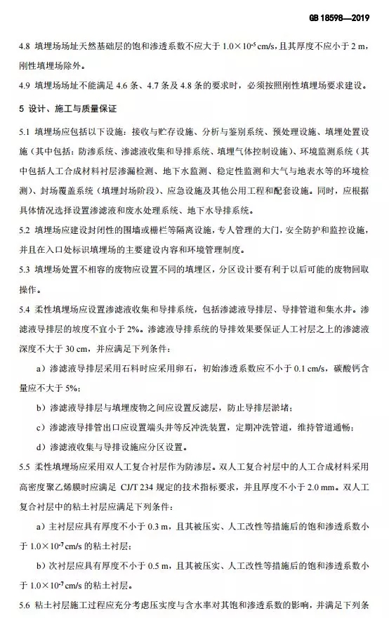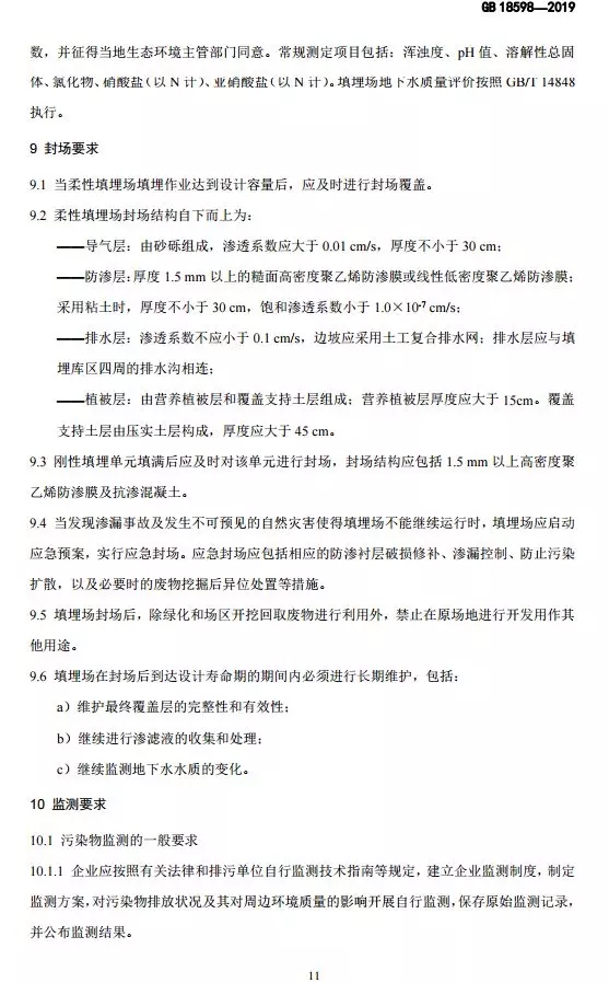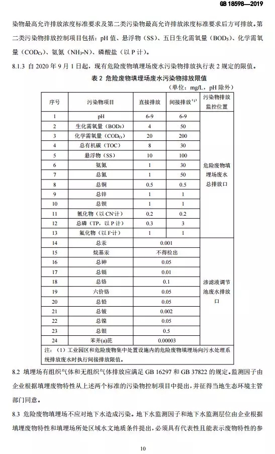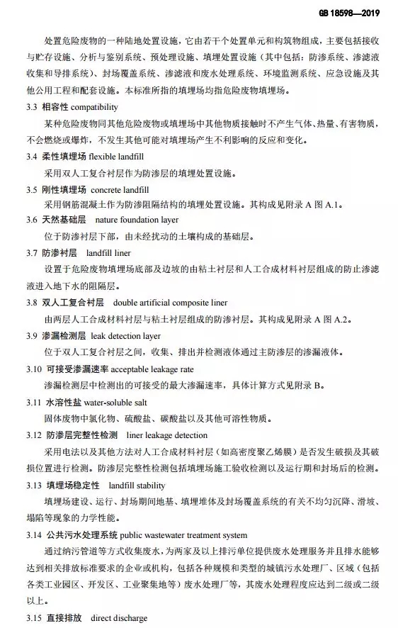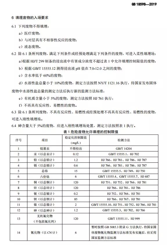 抄送:各省、自治區(qū)、直轄市生態(tài)環(huán)境廳(局),新疆生產(chǎn)建設(shè)兵團(tuán)生態(tài)環(huán)境局,環(huán)境標(biāo)準(zhǔn)研究所。 生態(tài)環(huán)境部辦公廳2019年10月10日印發(fā) 為貫徹《中華人民共和國環(huán)境保護(hù)法》《中華人民共和國固體廢物污染環(huán)境防治法》《中華人民共和國土壤污染防治法》,本標(biāo)準(zhǔn)規(guī)定了危險廢物填埋的入場條件,填埋場的選址、設(shè)計、施工、運(yùn)行、封場及監(jiān)測的生態(tài)環(huán)境保護(hù)要求。本標(biāo)準(zhǔn)首次發(fā)布于2001年,本次為首次修訂。此次修訂的主要內(nèi)容:規(guī)范了危險廢物填埋場場址選擇技術(shù)要求;嚴(yán)格了危險廢物填埋的入場標(biāo)準(zhǔn);收嚴(yán)了危險廢物填埋場廢水排放控制要求;完善了危險廢物填埋場運(yùn)行及監(jiān)測技術(shù)要求。危險廢物填埋場排放的惡臭污染物、環(huán)境噪聲適用相應(yīng)的國家污染物排放標(biāo)準(zhǔn)。危險廢物填埋場的自行監(jiān)測按照本標(biāo)準(zhǔn)要求執(zhí)行,待本行業(yè)排污單位自行監(jiān)測指南發(fā)布后,從其規(guī)定。本標(biāo)準(zhǔn)附錄A為資料性附錄,附錄B為規(guī)范性附錄。自本標(biāo)準(zhǔn)實施之日起,《危險廢物填埋污染控制標(biāo)準(zhǔn)》(GB 18598-2001)廢止。