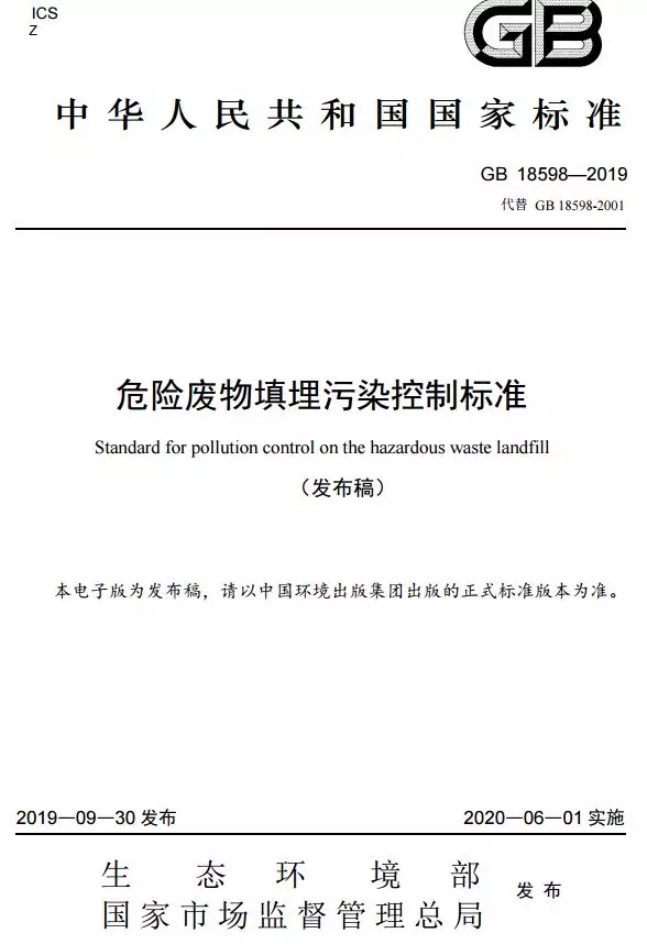 Standard for pollution control on the hazardous waste landfill